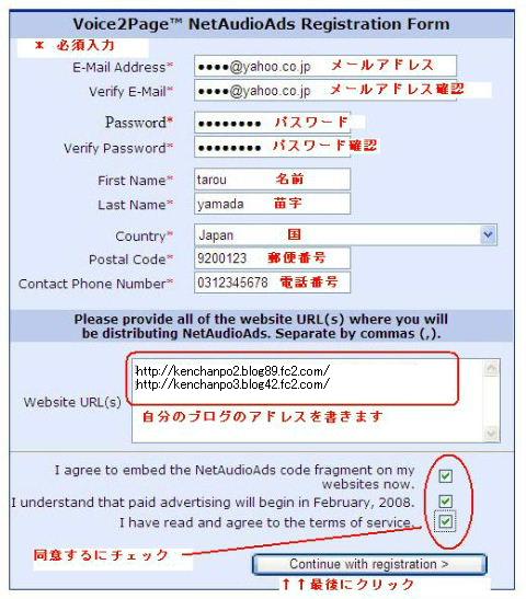 同意するのチェックは全部入れて、下のボタン(Continue with registration)をクリックしてください。